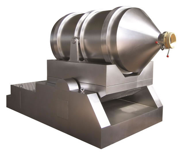 Le mélangeur bidimensionnel de série EYH constitue principalement un cylindre rotatif, un support pivotant, et un cadre. Le cylindre rotatif se trouve sur le support oscillant soutenu par quatre roues, son axe est orienté par deux roues de capture. Deux des quatre roues sont entraînées par le système d'alimentation en rotation pour permettre au cylindre de tourner. Le support d'oscillation du mélangeur bidimensionnel pivotant est entraîné par une structure de tige pivotante à manivelle montée sur châssis, le support oscillant est soutenu sur le châssis par des éléments porteurs.